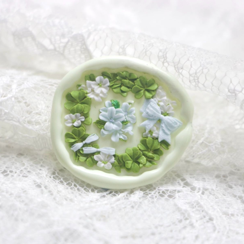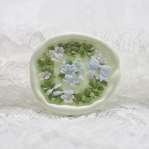 The Eir design features a high-precision laser-engraved relief of a lush clover wreath and delicate blossoms, accented by a graceful ribbon bow to create a soft, matte botanical scene of luck and healing.