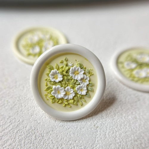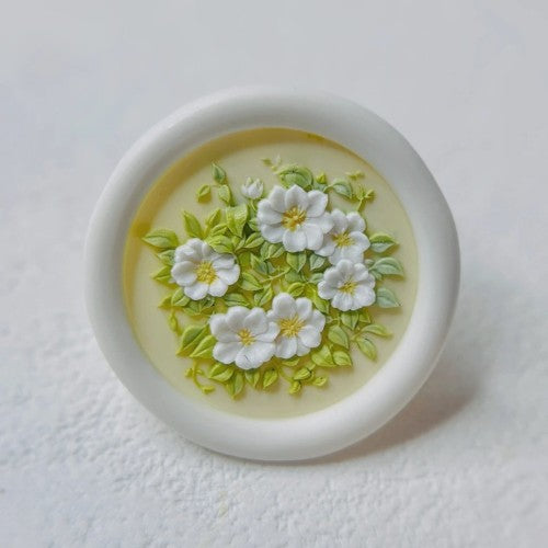 This exceptional wax seal head is a work of art, created using specialized deep-relief laser engraving to achieve a stunning, three-dimensional effect. The design features a charming cluster of five-petal flowers, reminiscent of delicate wild roses or dogwood, nestled amongst lush, beautifully rendered foliage. This dense botanical arrangement forms a natural medallion, evocative of the serene, untouched beauty of an island garden.